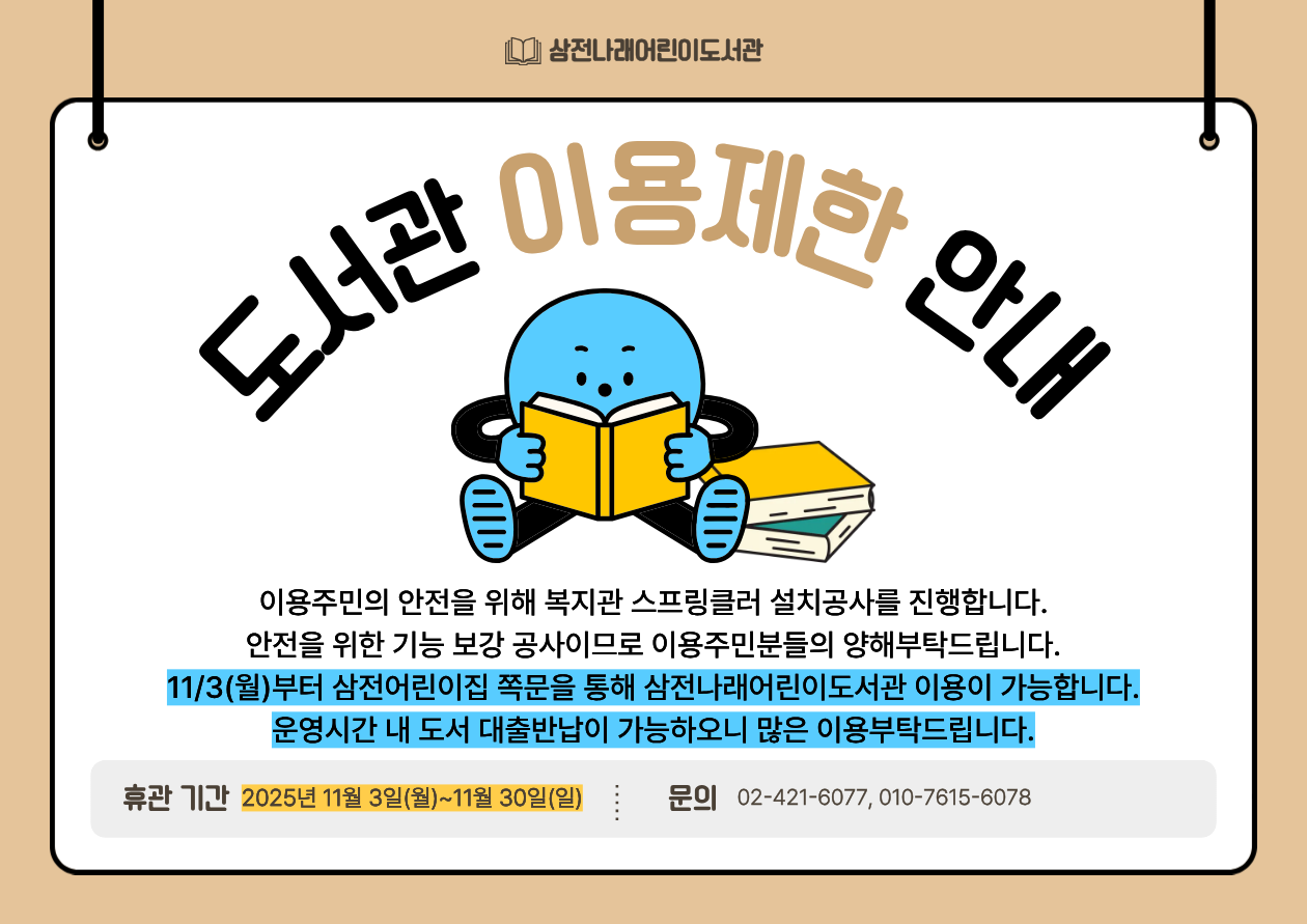삼전종합사회복지관 스프링클러 공사로 도서관 이용의 제한 안내
